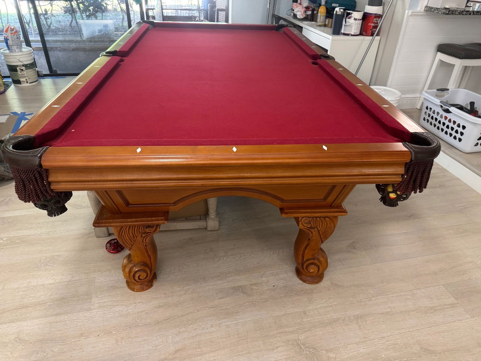 Classic 4×8 pool table with brand new felt. Solid construction, great playing surface. Includes free delivery and professional setup in the Tampa Bay area. Ready to play!